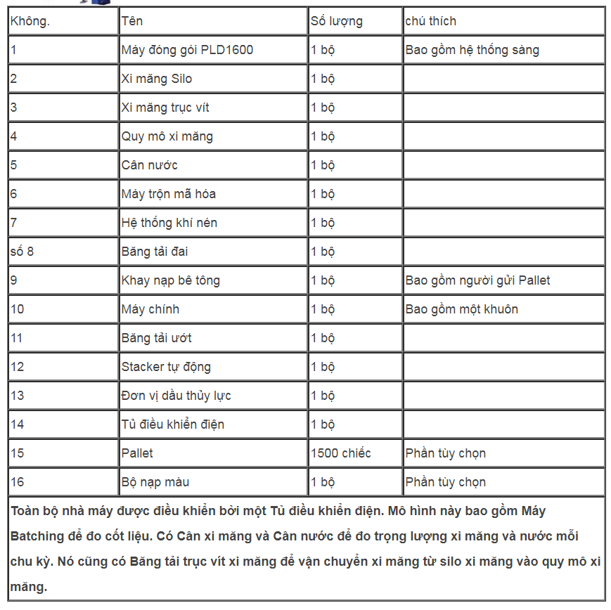 | 4 | Khay nạp bê tông | 1 bộ | Bao gồm người gửi Pallet |